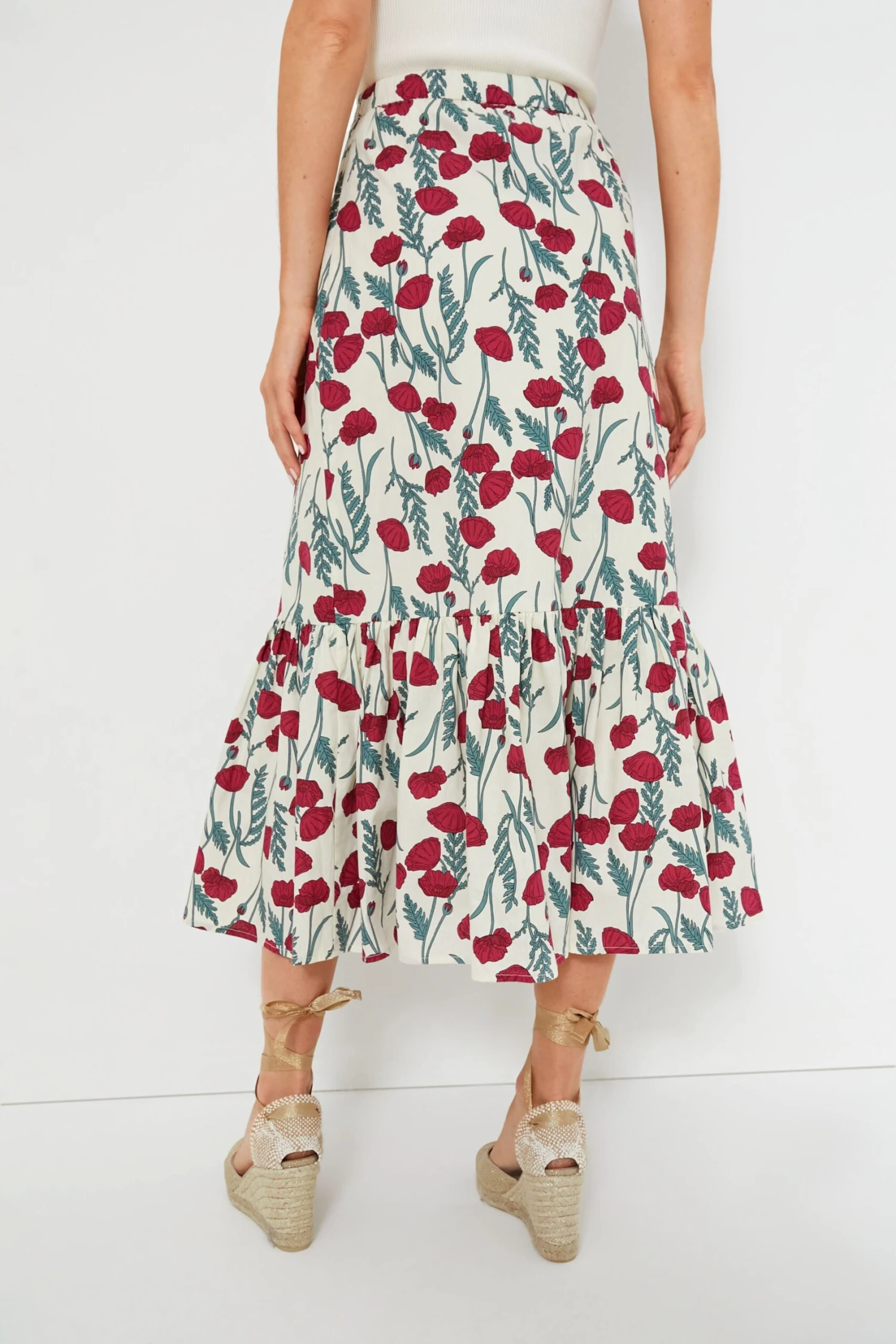 Flirty and chic, the Amaryllis Floral Tanner Skirt is a maxi that boasts a ruffle hem and deep red and green floral design reminiscent of a rose garden. The straight silhouette flows into a wide ruffle hem, creating a flattering and sophisticated look. Pair with a body suit and heels for date night, or with a sweater and boots for cozy drinks.Â