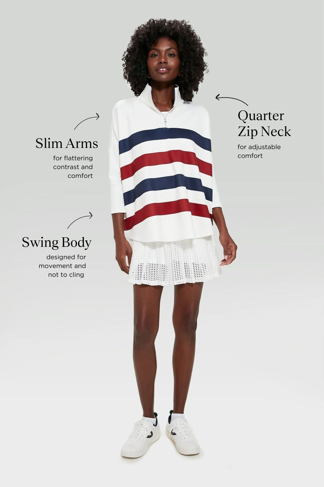A crisp, cool, completion to any look, the Americana Stripe Martina Quarter Zip plays just as well over a performance top as it does draped over your shoulders. Designed with mobility in mind, this striped number features a swing shape and slim arms for optimal movement. Featuring a quarter zip and stand collar with a chambray interior for cool contrast, this red, white, and blue number gets a sporty update. This outfit finisher makes for the perfect warm-up or cool-down piece and pairs well with any and all workout gear from leggings to tennis skirts!