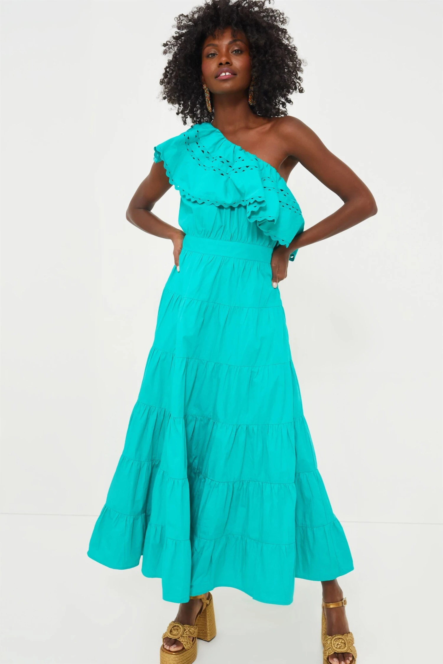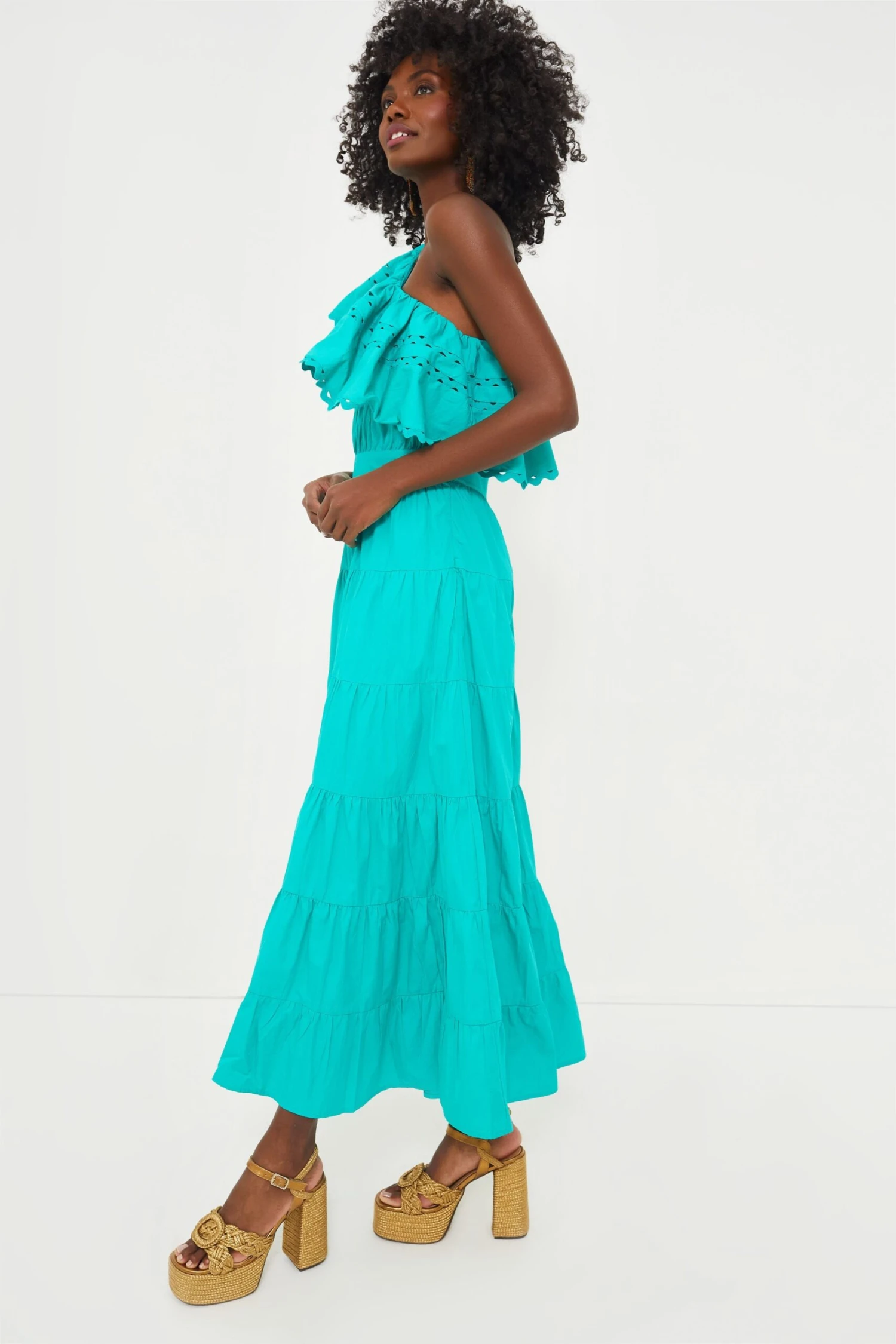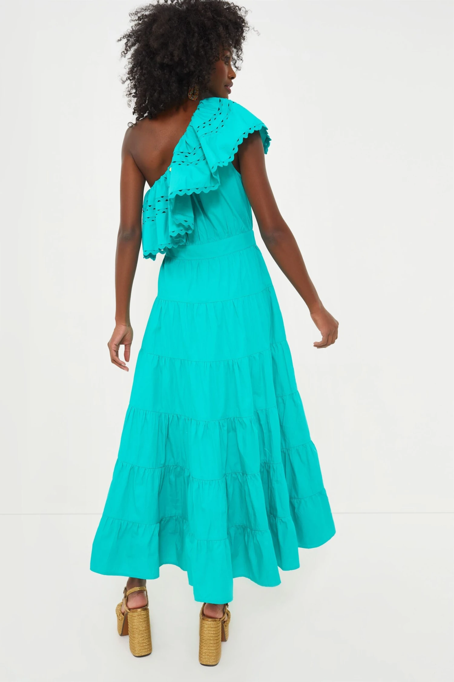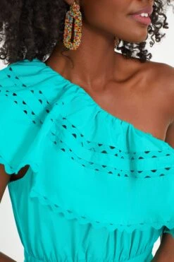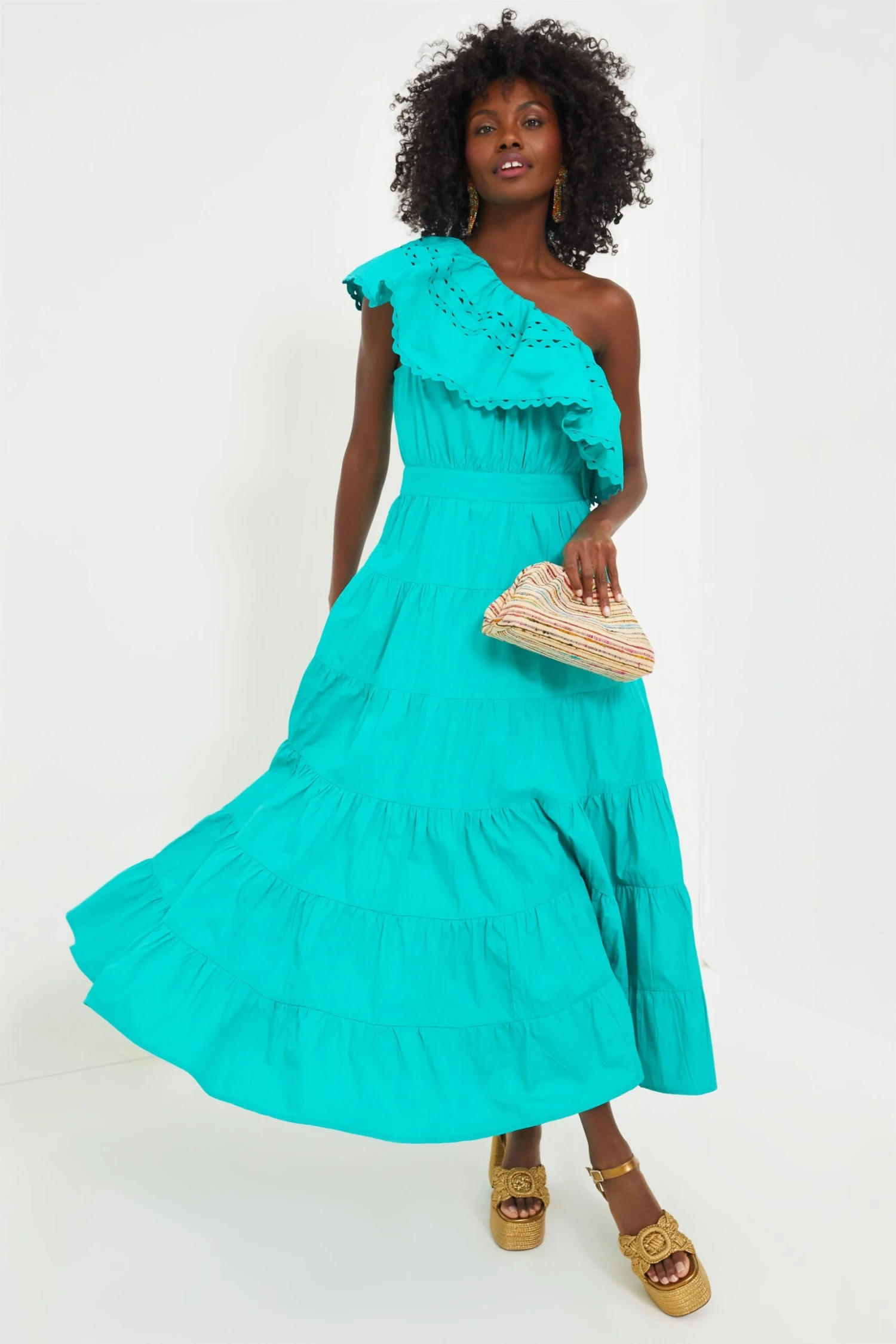 The Aqua Rodo Sundress is fit for a princess. A cotton poplin maxi with an asymmetrical neckline and ruffle sleeves, this flattering style is eye-catching, vibrant, and oh-so-elegant. Pair with espadrilles and statement earrings for a tropical-chic look that is perfect for brunches, dinners, and resort stays.