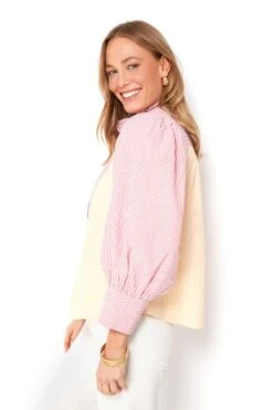 Your classic button down reinvented– meet the Red Polette Blouse. A feminine ruffle collar plays well with the slightly puffed sleeves and button front placket while the red and yellow colorblock stripes add a playful and fun feel. Pair with trousers and flats for a day in the office or play it cool and opt for your favorite denim for an it-girl weekend look.Â