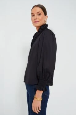 Effortlessly chic, the Black Bonnie Shirt takes everything we love about a classic button down and elevates it with fun, feminine details. Featuring a ruffled stand collar, smocked cuffs with a subtle frill, and an easy front placket, this stunning silhouette pairs as well with jeans and sneakers for daytime as it does with a mini skirt and gold jewelry for happy hour!