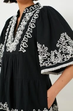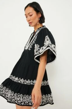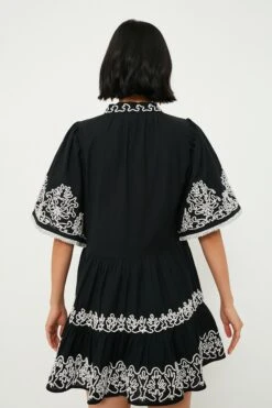 The Black Cordera Embroidery Short Sleeve Tiered Dress is a perfect addition to your LBD collection. Crafted in an airy cotton blend with a notched neckline and swirling contrast embroidery, this mini is equal parts classic and fresh. Pair with simple white sneakers and a crossbody for a casual warm-weather day, or with sandals and sunnies for your next getaway!