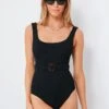 The perfect blend of style and support, turn heads in the Black Nancy Swim One Shoulder. Featuring their classic crinkle style with an updated asymmetrical neckline, this sassy suit hugs the body in all the right places thanks to the material, which stretches and retracts to give shape without losing its own. Add raffia accessories and bright sunnies for colorful poolside style on your next getaway!