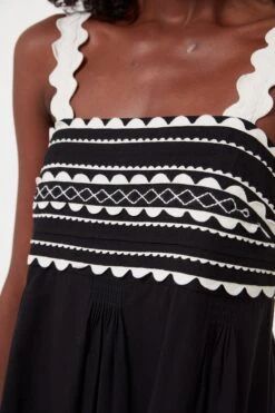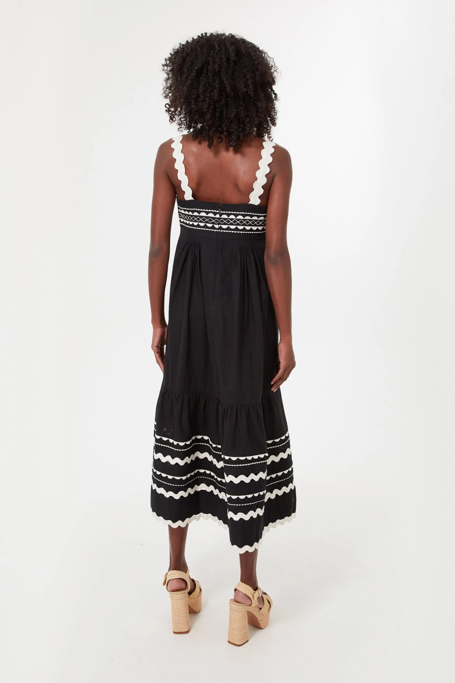 Delightful as ever, we are loving how the Black Ryleigh Dress puts some spring in our step. With the whimsical nostalgia of ric rac trim scattered throughout at the bodice, hem, and even the shoulder straps, in a sophisticated neutral color palette, this chic midi will have you looking perfect for any occasion. Dress it down for a day of walking around the city with your favorite white sneakers and some oversized sunnies, or dress it up for a romantic dinner date with espadrilles and statement earrings.