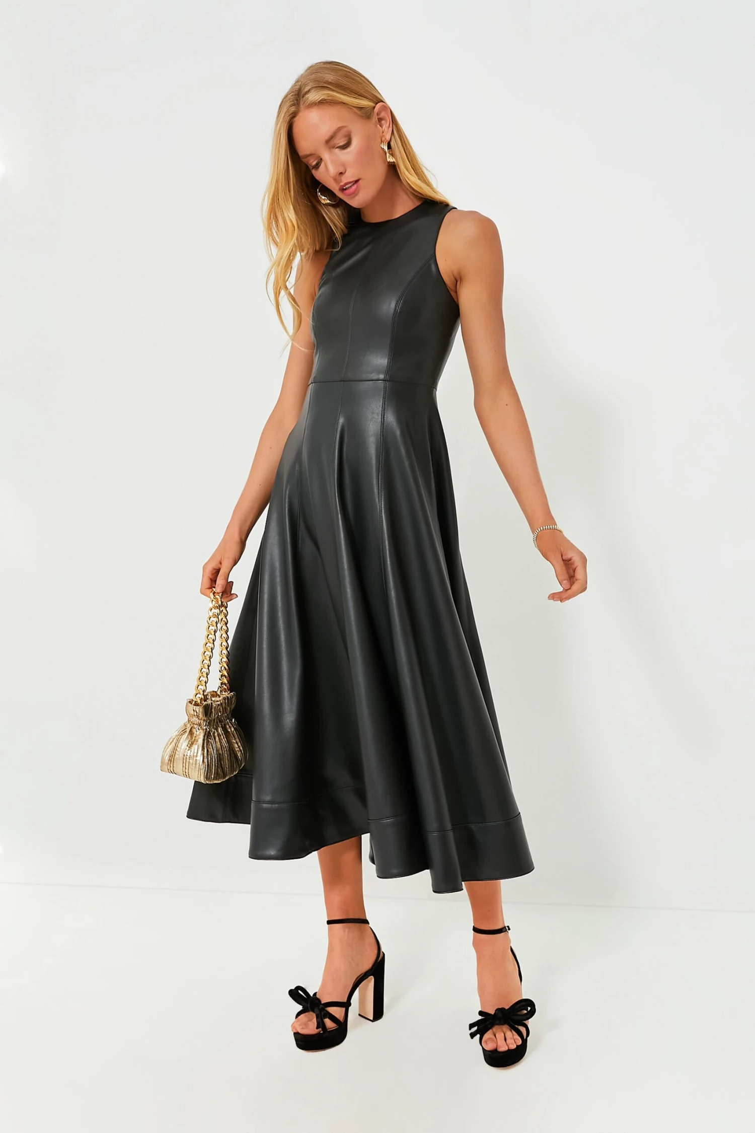 Look beautiful and chic with the Soline Dress. Crafted with vegan leather, it features a classic A-line midi silhouette with a crewneck, fit to flare design, along with pockets for a touch of modern style. Perfect for all seasons, we are styling this dress with a chunky gold necklace, black block heels, and a clutch purse for a striking date night outfit.Â