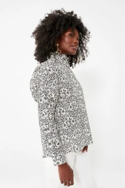 The 18th century-inspired Black Wind Blouse has a beautifully structured silhouette we can’t stop thinking about! Featuring a ruffled collar, long gigot sleeves, and a front button placket, this neutral top is a fun twist on the traditional button-down. Made from a crisp cotton poplin, we love the sophisticated drama that the volume in the sleeves adds. Style this piece with high waisted trousers, pumps, and statement earrings for a desk to drinks look, or dress it up with a mini skirt and glitzy clutch for date night.