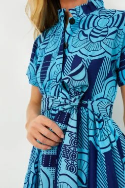 Subtle in silhouette, with a bold touch from the fantastical print, the Blue Olori Dress is a stellar statement-maker! The elegantly structured mock neckline and sleeves are balanced by the floaty tiered skirt to create a style that is equal parts soft and strong. Pair with heels and gold jewelry for luncheons with your ladies, or with a clutch and statement earrings for a night out on the town.