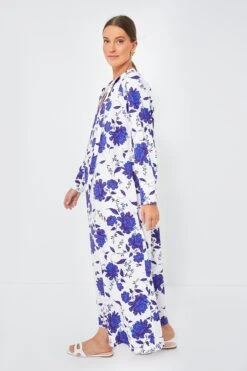 is adorned with a beautiful blue floral motif and is finished with a unique U-neckline and wide neck ties. Perfect for oceanside lounging, strolling around the resort, and grabbing a cocktail at the beach bar, this breezy silhouette is full of carefree elegance. Finish with sandals and a sunhat to go casual or wedges and raffia earrings to transition into evening.