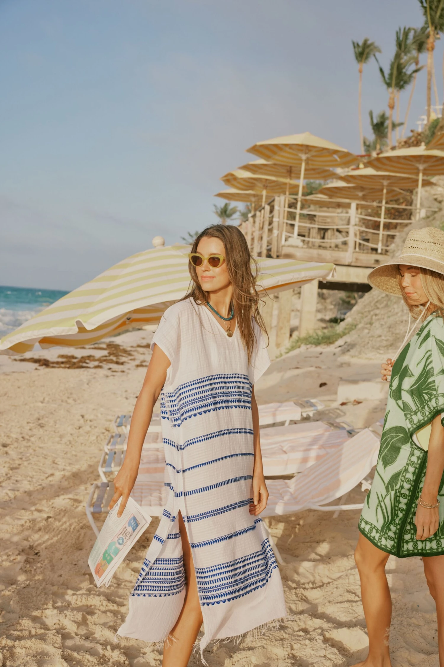 Simple yet sophisticated, we are taking the Blue Yani Classic Caftan with us on beach days, tropical getaways, and girls weekends this season! Handmade from traditional Ethiopian tibeb cloth, this midi silhouette with a notched neckline, batwing sleeves, and a fringed hem has you covered on even the sunniest, hottest days ahead. The flowy shape will float beautifully upon the ocean breeze and ensure you look and feel cool when you pair it with a sunhat and sandals for a day by the pool or a stroll on the sand.