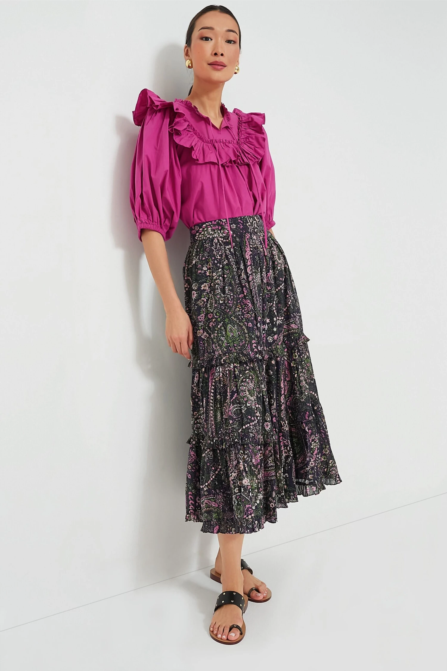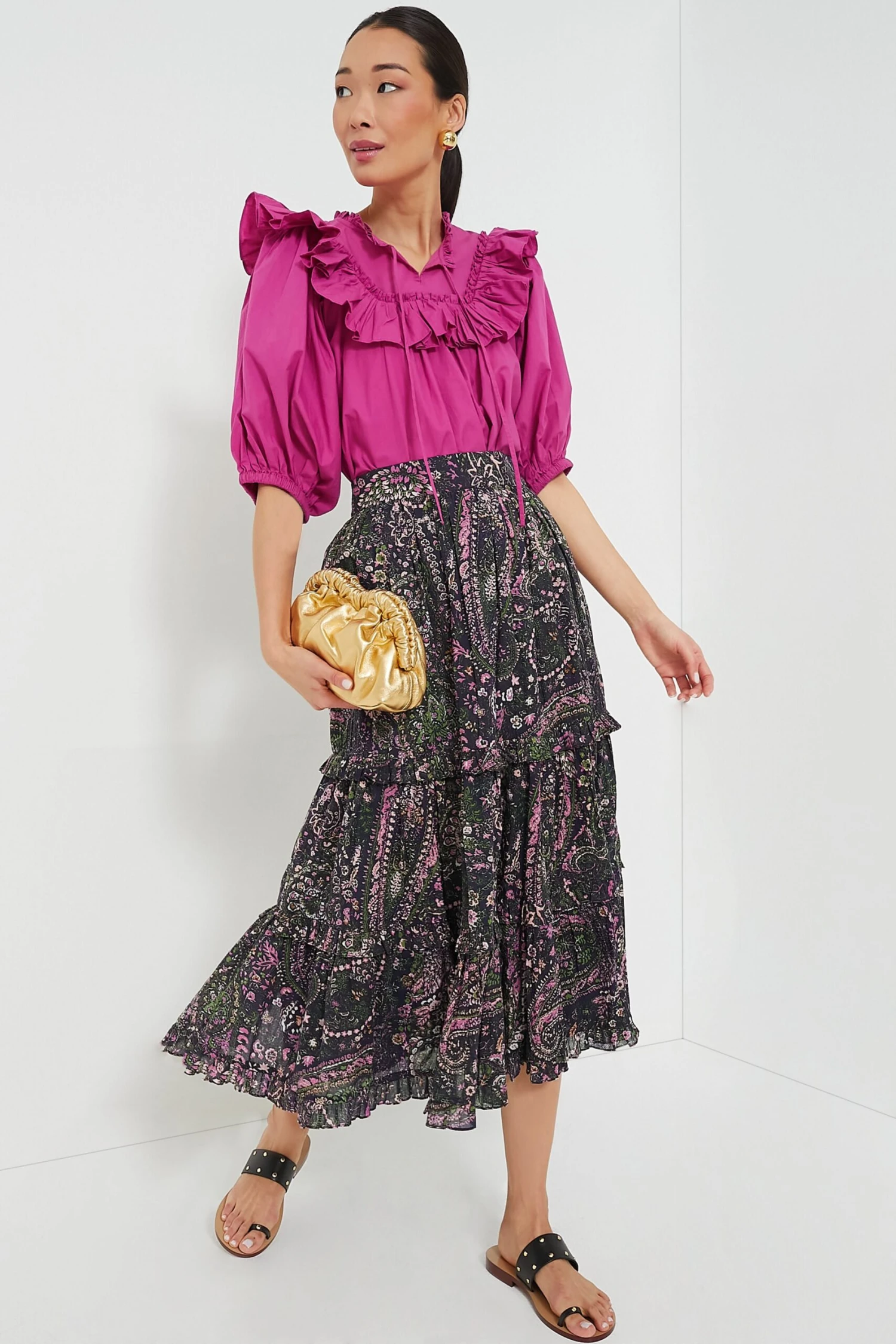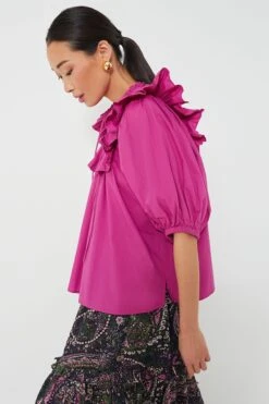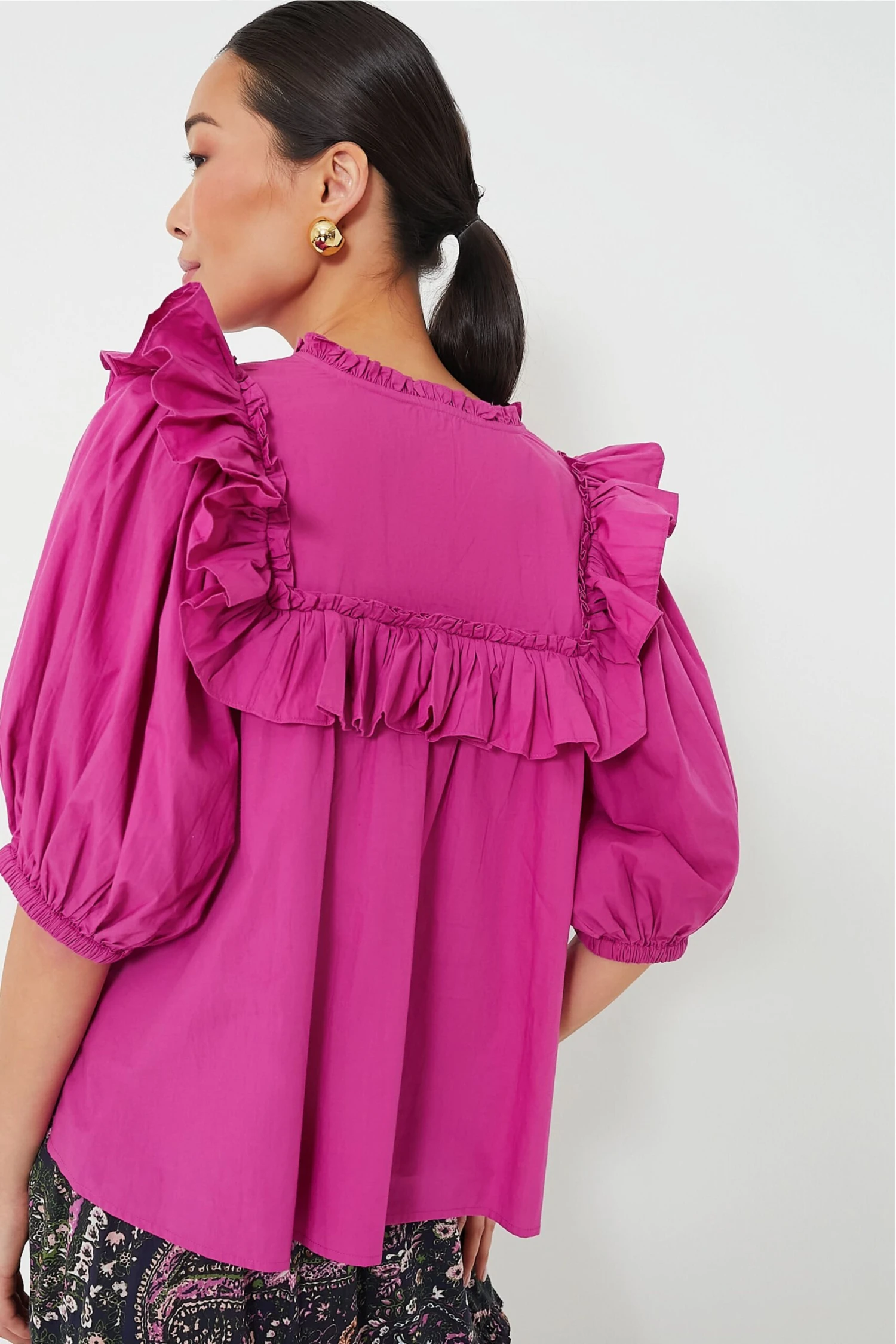 The perfect top to pair with all of your favorite bottoms, the Bright Pink Janet Blouse is an effortless closet staple. Full of feminine details — like dramatic puff sleeves and fun ruffle trim around yoke as well as neck. Wear it to the office with slim trousers and ballet flats, with skirt and heels for brunching with your gals, or with denim and gold hoops for all the weekend adventures you have planned.