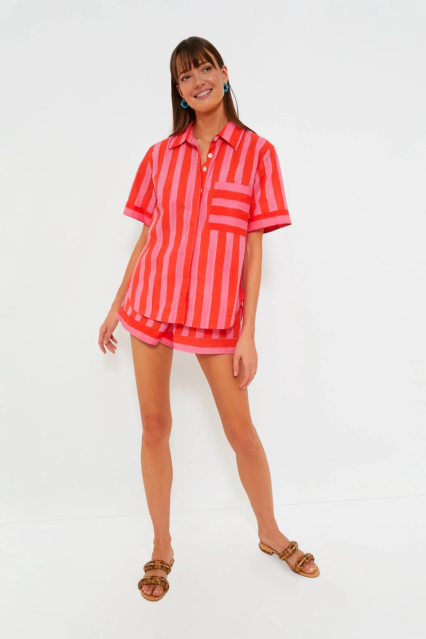 Block-printed by hand in Pink City Print’s vibrant Bubblegum Stripe, the Cally Set is an adorable throw-on style. With a relaxed fit and comfortable, elasticized shorts, this set is an effortless favorite you’ll wear again and again. The silhouette gives a vintage-feel with turn-up details on the sleeves and hem, and the bright pattern is girly and fun. Wear with sneakers to grab coffee or with fuzzy slippers for relaxing at home.Â