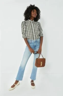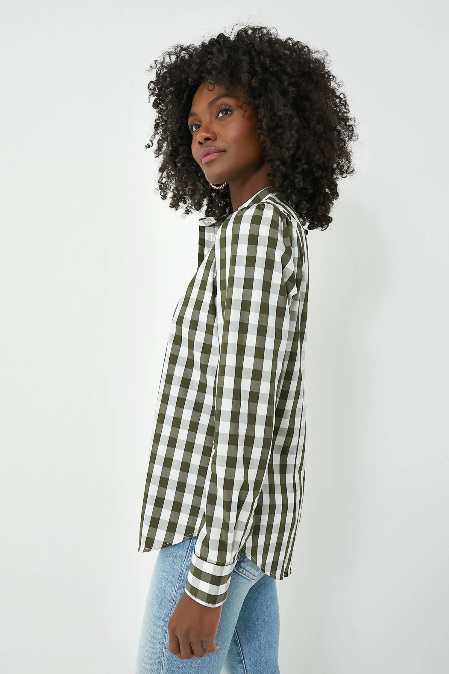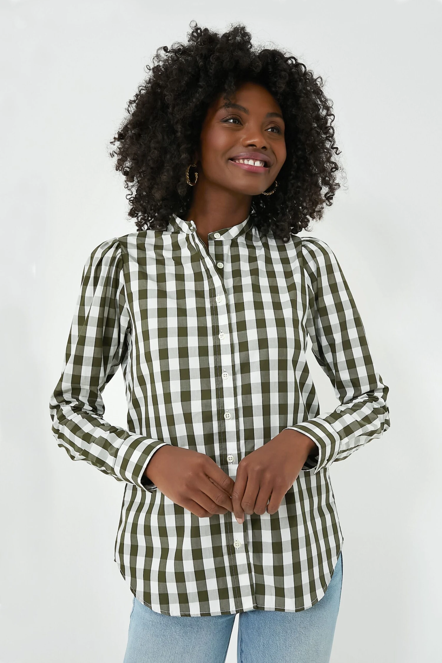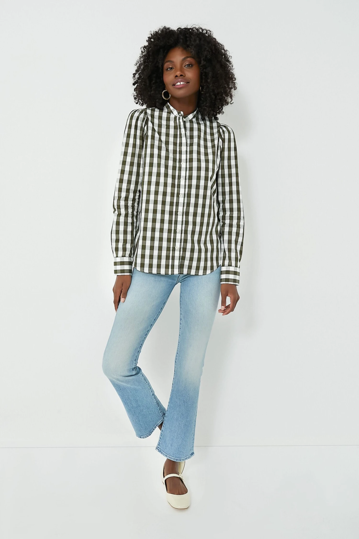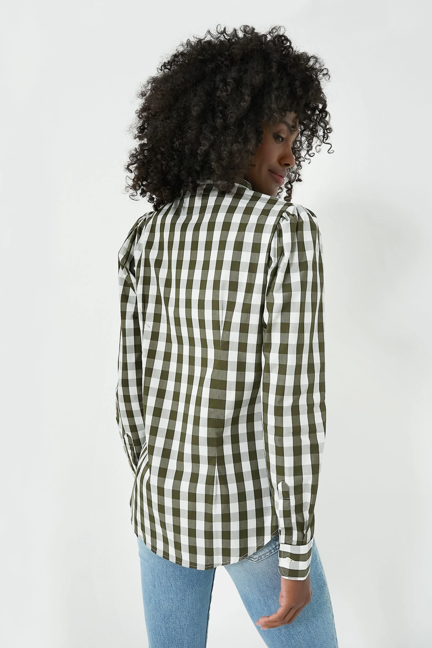 For business or pleasure, the Forest Puffed Shoulder Shirt is shapely in all the right places with subtle gathering at the shoulders and stand collar. Featuring long sleeves, a front button placket, and No Gape® button technology, this silhouette has got you covered (literally!). Beautifully made from a checkered cotton and produced in Portugal, we are styling this piece with flared denim, ballet flats, and a tote for the perfect desk to drinks look.