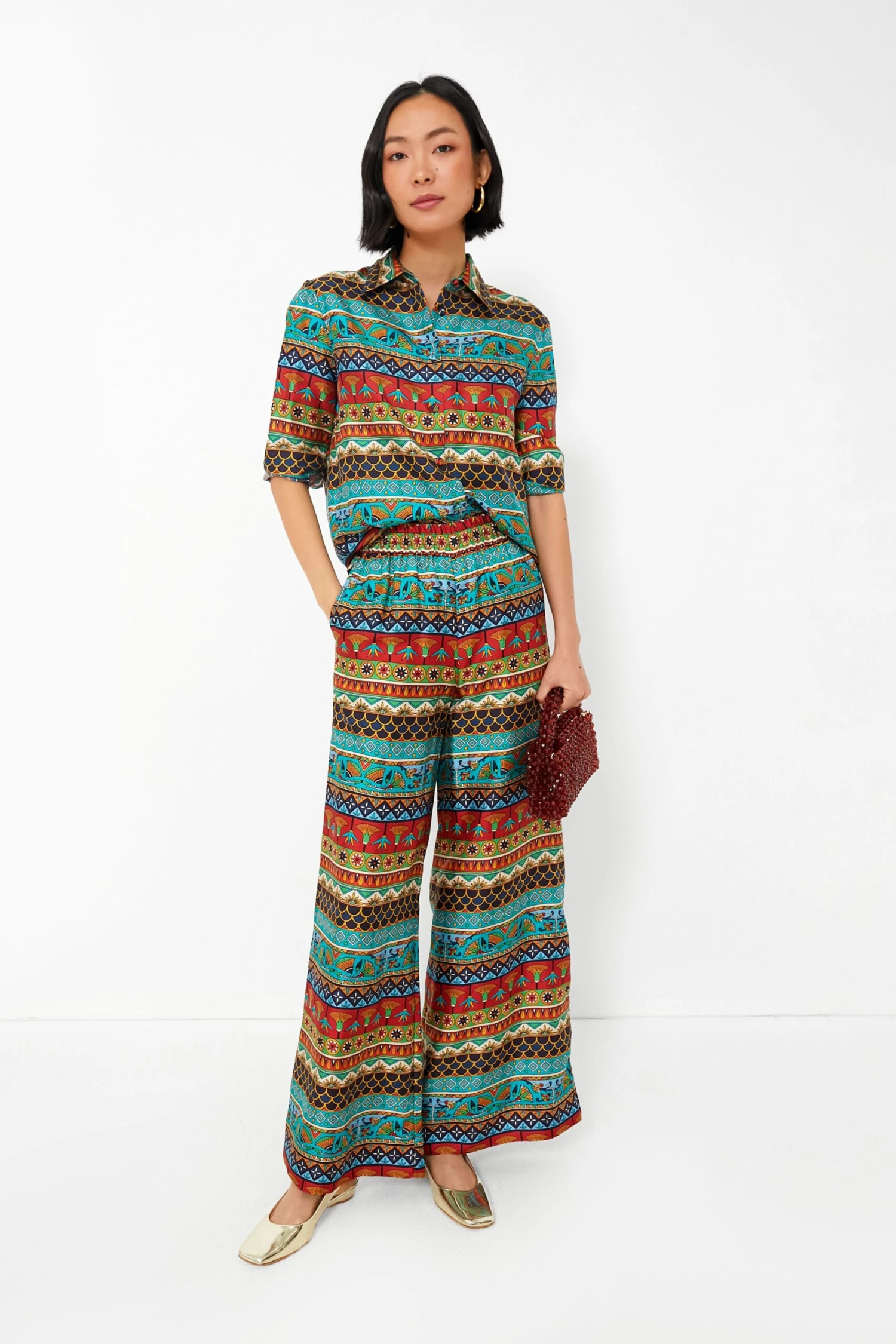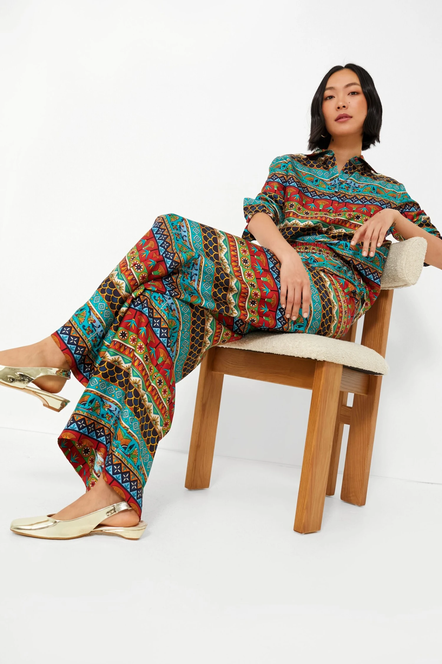 The Giza Boy Shirt is the classic button-down reimagined. Combining a rich multicolor pattern inspired by the splendor of Ancient Egypt, and crafted in a glossy silk twill manufactured on the shores of Lake Como, this special piece features a spread collar, front button placket, and back box pleat for easy movement. Perfect for adding that va-va-voom effect to your look, we are styling this with a midi skirt and boots for an effortless yet elevated look, or with the matching pants to go full maximalist!Â