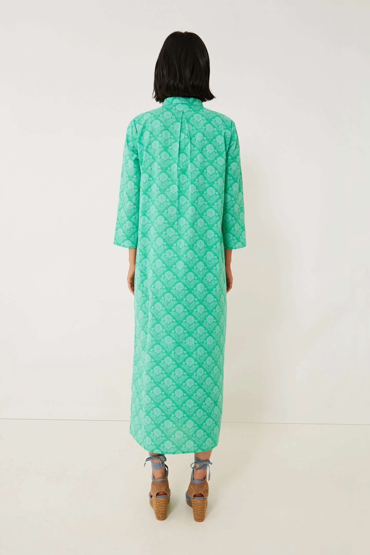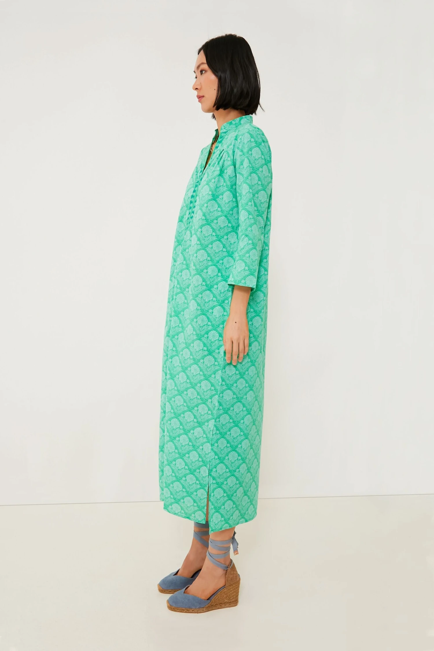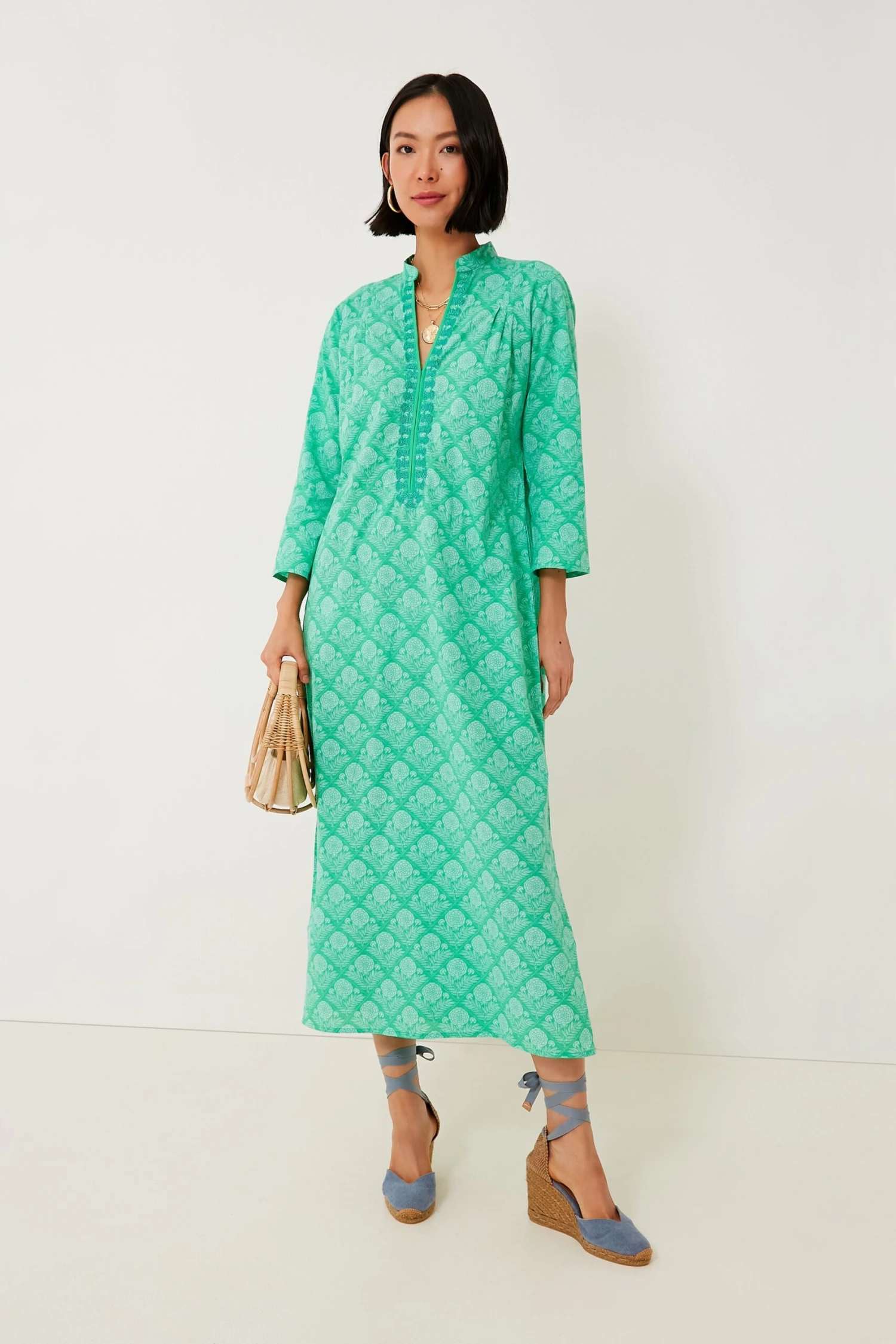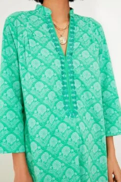 The Green Lauren Clorinda Long Kurta reminds us of fresh air and the twinkly blue sea. This flattering and comfortable caftan silhouette features a midi length hem, a band collar with a V-neckline, and three-quarter length sleeves for that beautiful, boho-chic look we all know and love. Timeless and ultra-breezy, this is a must-have for your next getaway — just pair with sunglasses and espadrilles for an effortless beach to bar look.