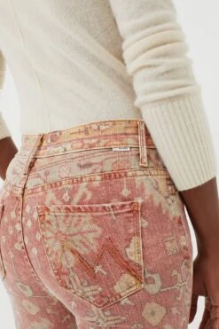 The Rug Burn The Super Cruiser by MOTHER are the statement pants we have all been searching for. With a flattering high rise and flare silhouette, these jeans are complete with a faded Moroccan rug print in soft shades of salmon, yellow, and mint green. Pair with a plain sweater and boots for an eye-catching all-day look.Â