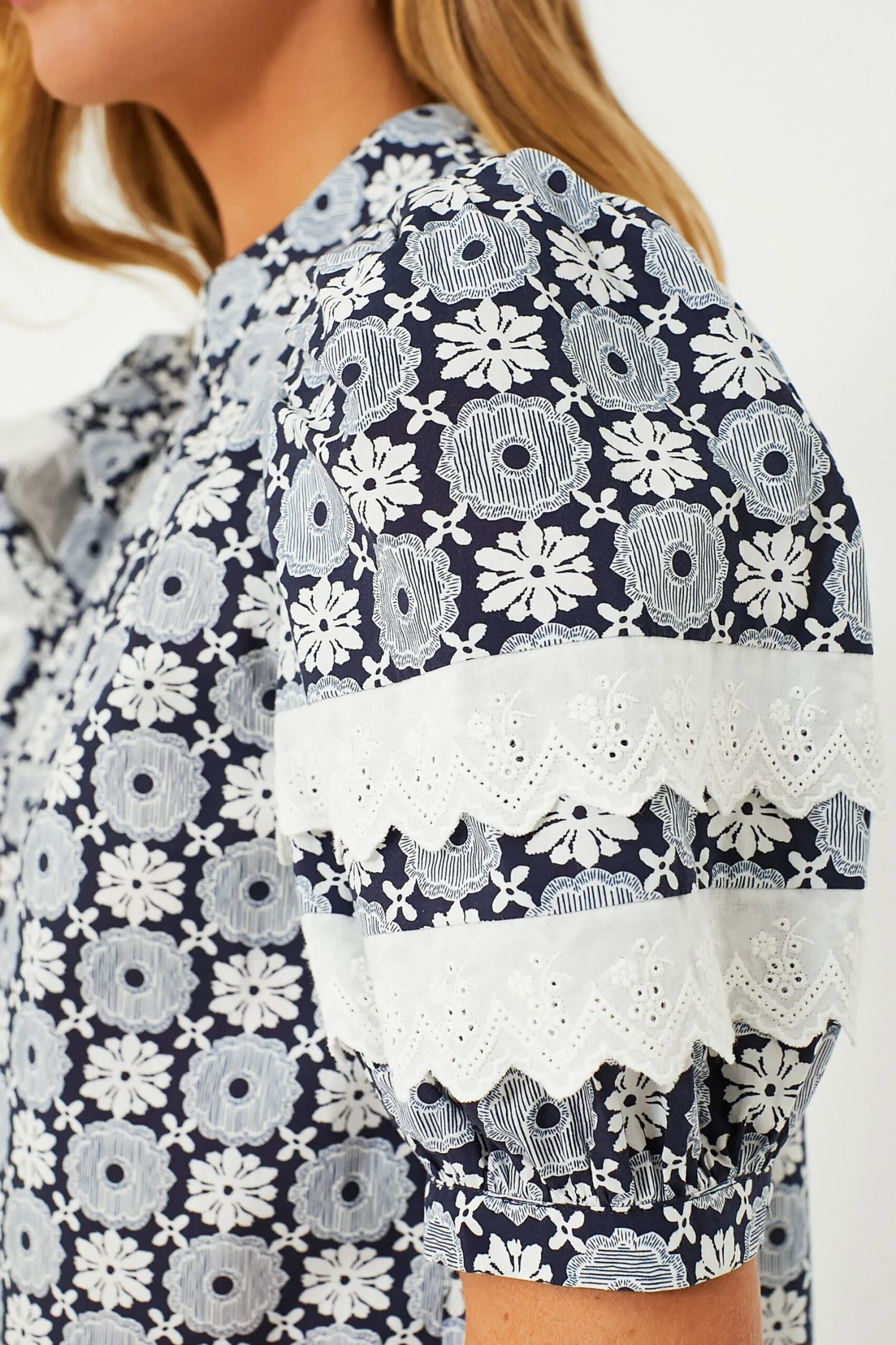 - Short puff sleeves with eyelet bands