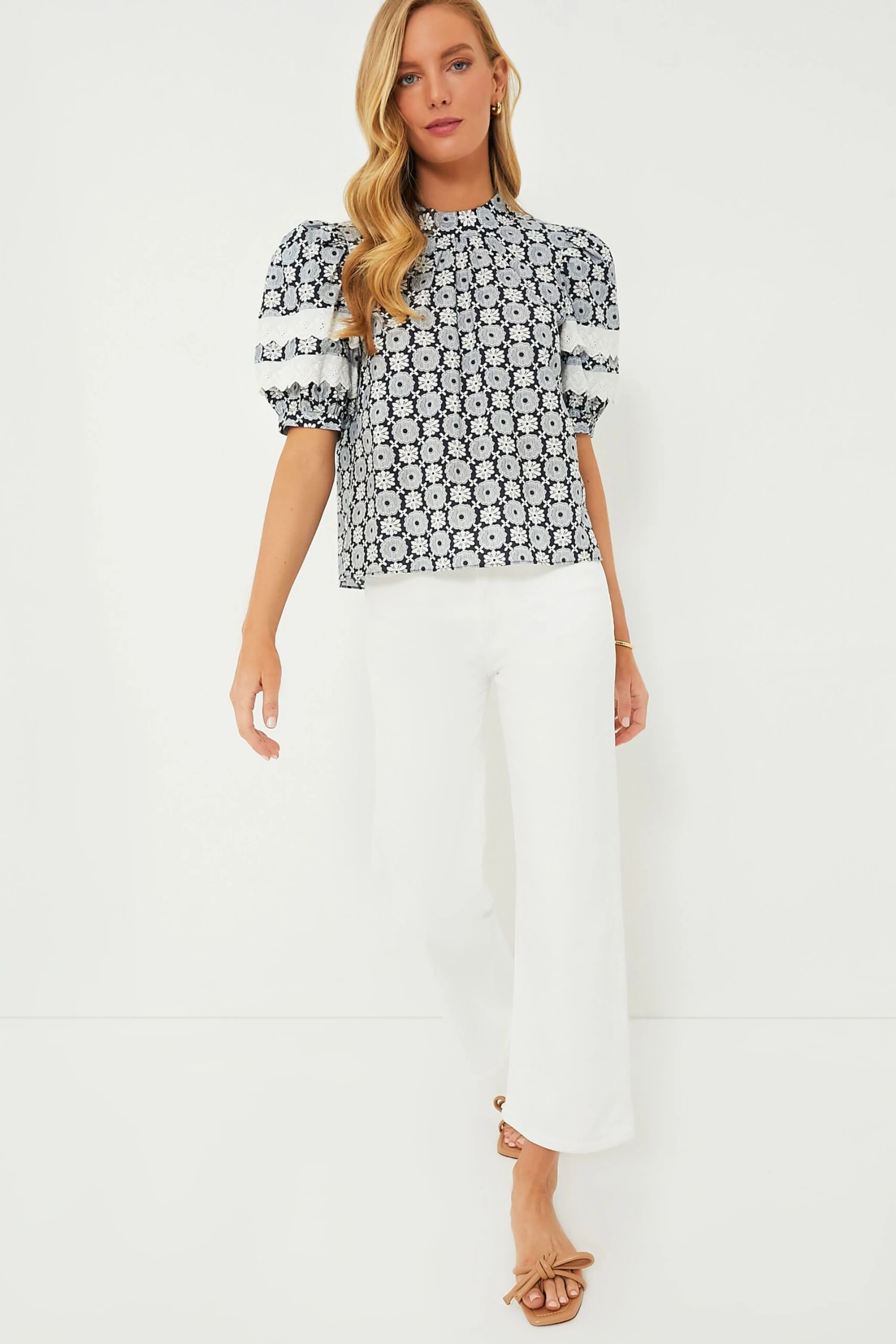 The Navy Geo Floral Gigi Blouse is an adorable, feminine style that is perfect for the warm-weather months. The flattering silhouette boasts large puff sleeves with eyelet bands, an eye-catching geometric pattern, and a high collar. An easy (yet elevated) throw-and-go style, we are pairing this with white pants and sandals or denim shorts and sneakers!