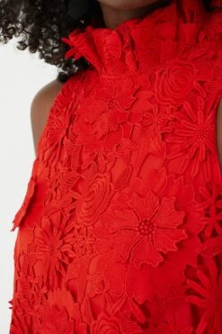 A Tuckernuck style staple, the Mason is back and better than ever. Our design team spent months perfecting and testing our signature stand collar to get it just right. As Marvin Gaye once said: “Ain’t no collar high enough,” so bring on the ruffles and drama! Updated in a beautiful, fiery red, three dimensional lace fabric, this swing shape blouse reminds us of our favorite mod silhouettes from the 60s and 70s. Ready for al fresco dinners with family, cocktail parties with friends, and every social event on your calendar, the occasions are endless for this bow tie-back top!