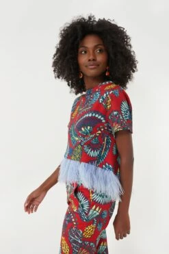 Want to add a little drama to the everyday? Allow the Sicomore La Scala Tee to take to the stage. This beauty features a cropped T-shirt silhouette with a fabulous contrast ostrich feather trim. As great for a sassy city look as it is for special events, this is a staple for your closet with plenty of fun details. Style with high waisted jeans and pumps for date night, with a mini skirt and a clutch for your next RSVP, or with the matching Sicomore Hendrix Pants for a coordinated maximalist look!