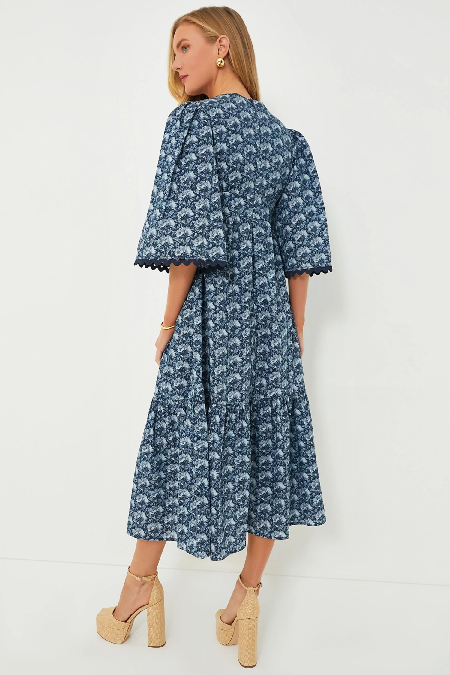 Once you arrive at your destination, enjoy the warm breeze and the Slate Blue Floral Rhoda Dress. Made in a soft lightweight cotton, this maxi is a chic and timeless piece meant to be worn season after season. Boasting a deep V-neck, quarter length bell sleeves with a playful ric-rac trim, and a tiered skirt, this silhouette is both flattering and classic. Style with espadrilles and a clutch for a warm-weather vacation or to attend a seaside wedding, or go casual with strappy sandals and a sun hat.