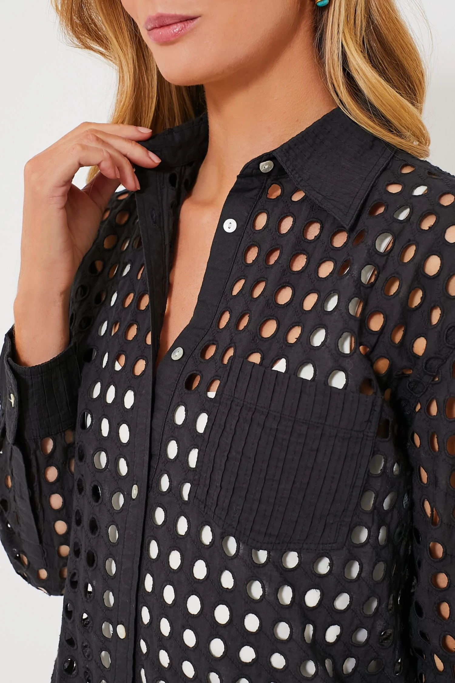 The Black Eyelet Oxford Tunic is a classy and modern top that has endless styling options. This button-down is complete with a front chest pocket, button cuffs, and an eyelet detailing all over. Wear over a bathing suit for a chic coverup, or with a black tank top and pants for an eye-catching ensemble.Â