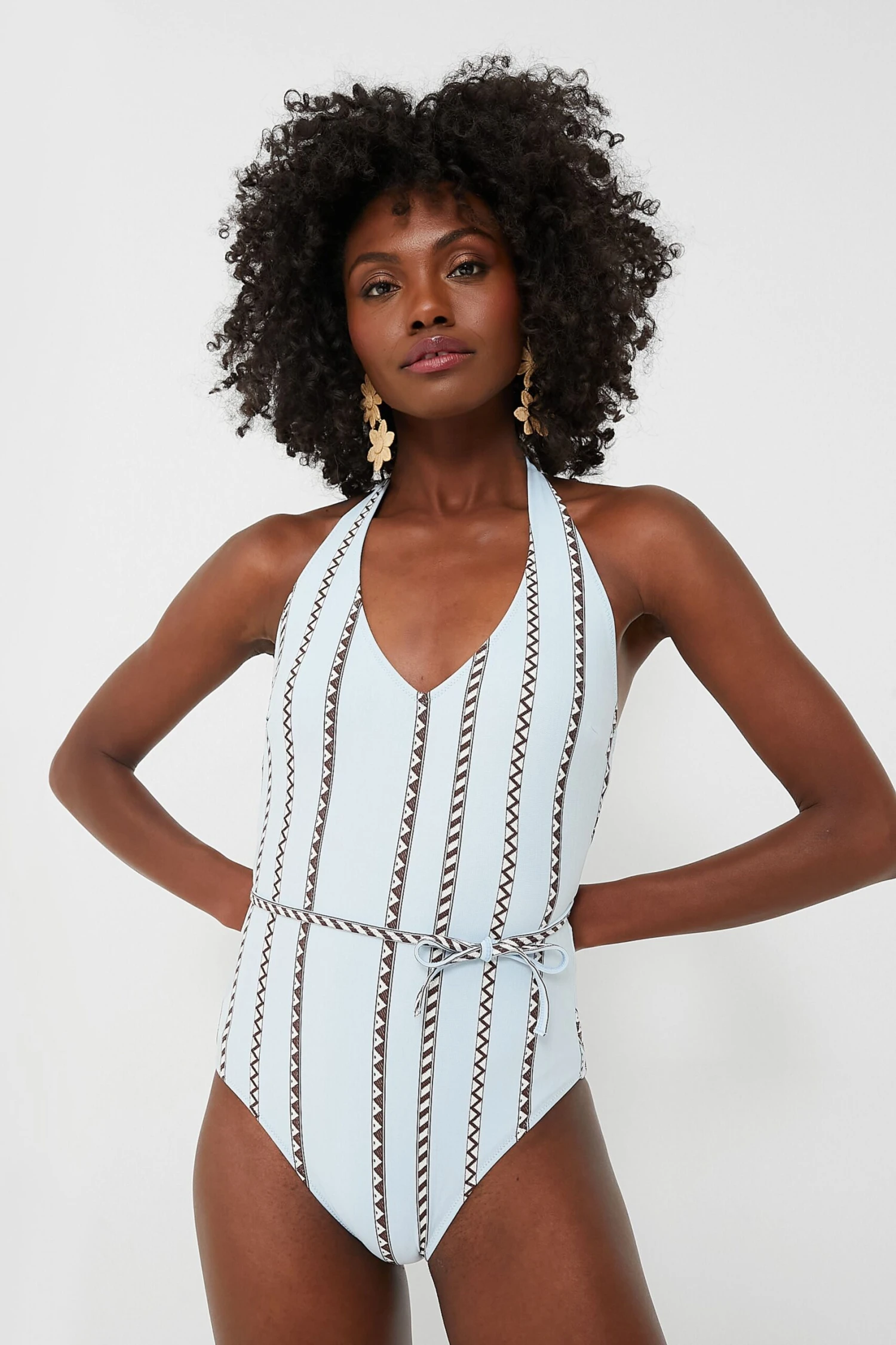 Tutu Blue Lidya One Piece Swimsuit is where simplicity meets sensuality. Made from a luxe jacquard stretch fabric with a removable belt, this sleek suit features a deep v-neck, low back, and an adjustable halter necktie. Pair with a sunhat and a caftan for a look full of modern sophistication on your next warm weather getaway!