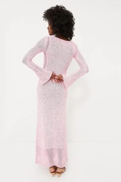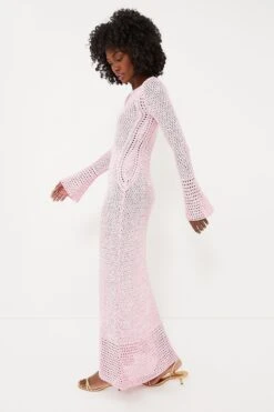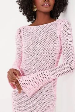 The Una Crochet Maxi Dress is a chic style perfect for lounging by the pool or grabbing beach-side drinks. The crocheted design showcases feminine details such as a bubblegum pink color, bell sleeves, and a contrast hem detail. The classic, fitted silhouette makes this a flattering throw-and-go style for the warm weather months.Â