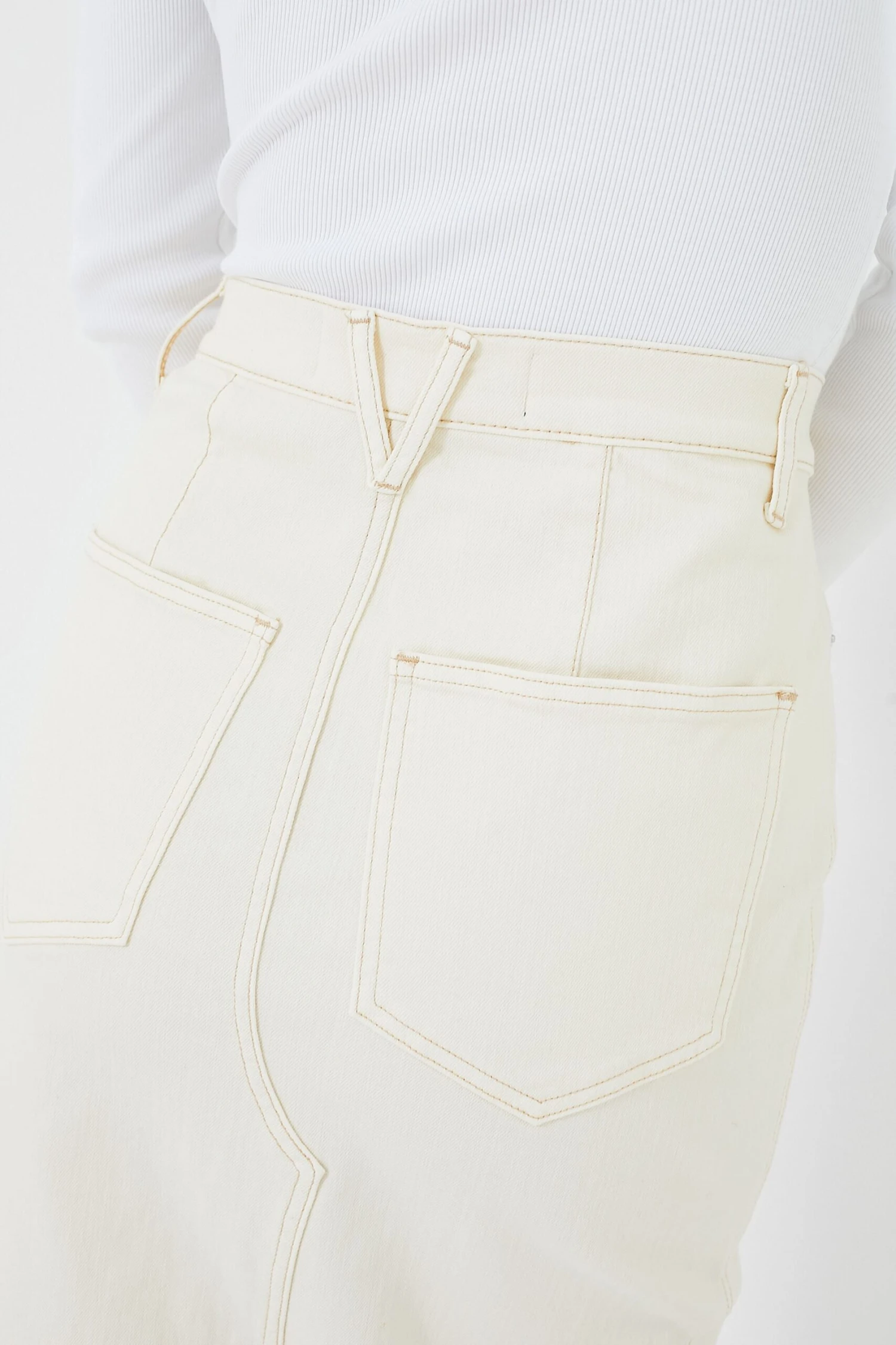 A great denim skirt is a cornerstone of every wardrobe. Introducing the Breves Skirt, expertly tailored from premium stretch ecru denim, with a flattering high-waist midi silhouette, a front slit and classic 5-pocket styling. Dress it up or down—or try it with a denim vest for a new take on double denim.