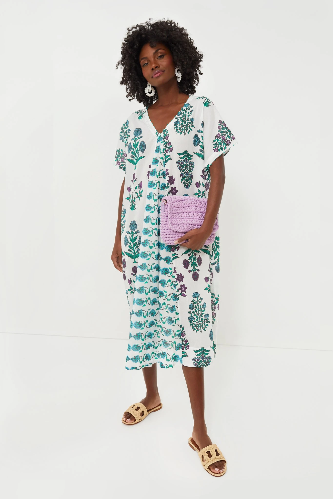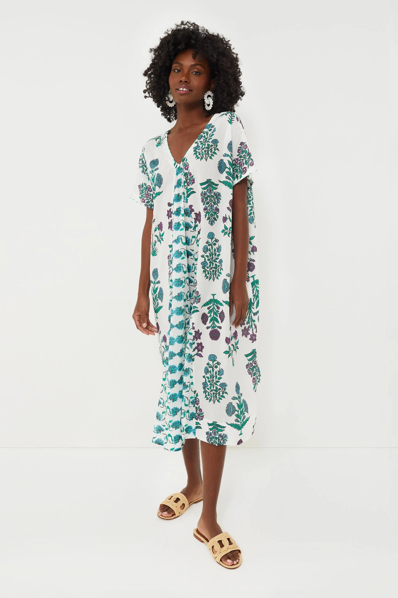 The Violet Olympia Tilda Kaftan is the ideal vacation style- the easy silhouette allows it to be worn on its own or as a coverup, and the fun contrasting patterns are vibrant and eye-catching. Elegant, comfortable, and versatile- we are styling this look with sandals and a sun hat or with wedges and statement earrings!