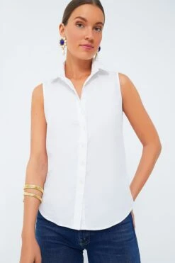 Say hello to easy layering with the White Sleeveless Essentials Shirt. Made from crisp white cotton with just a hint of stretch for the perfect fit, this button down is a must-have basic in every closet. Wearable four seasons a year, it is summer-ready when paired with linen shorts for an elegant look, or works great under a chunky knit with the collar poking through in colder weather.